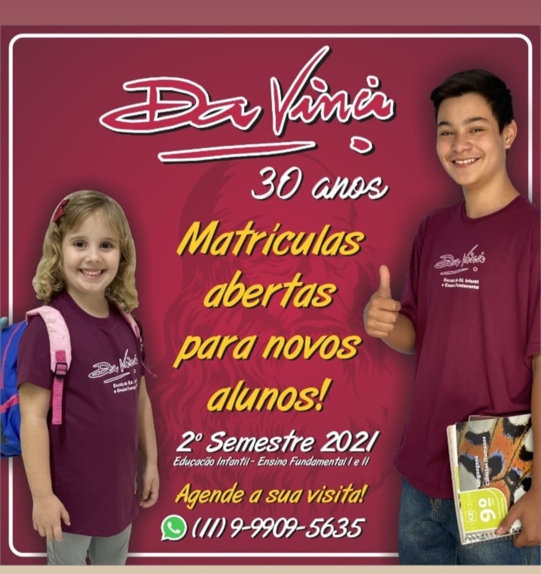 Escola Da Vinci – Trinta anos de tradição em Itatiba agosto 1, 2021agosto 30, 2021admin A Escola Da Vinci está com Matrículas abertas para o segundo semestre 2021! Agende sua visita – 11 – 9 99095635 Ficaremos muito felizes em recebê-los !
