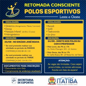 A Prefeitura de Itatiba, por meio da Secretaria de Esportes, iniciará a retomada consciente das atividades nos Polos Esportivos Leste e Oeste da cidade.
