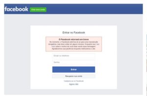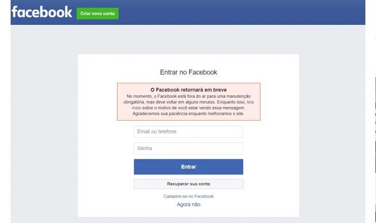 Também foram compartilhados nas redes sociais capturas de tela mostrando um erro no momento do login no Facebook, informando que o site está “fora do ar para uma manutenção obrigatória”, e a mensagem: “O Facebook retornará em breve”.