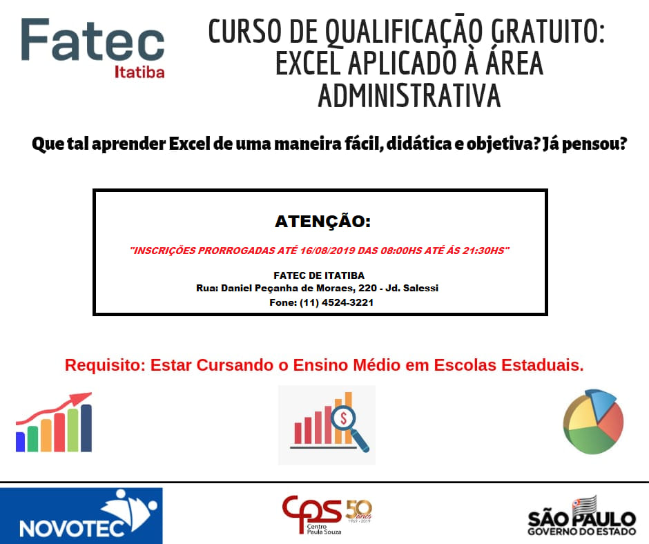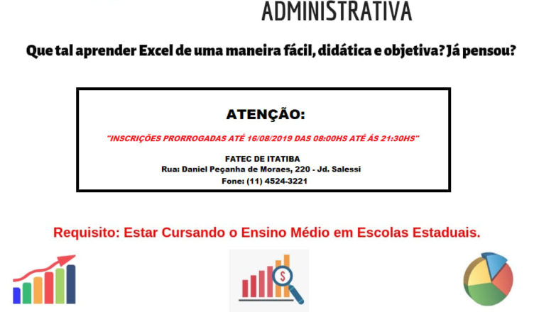 Prorrogadas as inscrições para o curso de Excel Aplicado a Administração. Corra até esta quinta-feira, dia 16, das 8h às 21h30.
