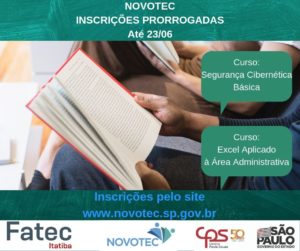 Fatec Itatiba junho 19, 2019admin NOVOTEC⚠️ 👉Prorrogadas as inscrições para os cursos do NOVOTEC até 23/06/2019! 👨🏫Acessem o site e faça agora mesmo sua inscrição: 💻www.novotec.sp.gov.br