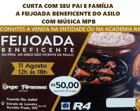 E ainda terá um grande show com a Banda Piracema. Passe um Dia dos Pais inesquecível participando da Feijoada Beneficente em prol ao Asilo São Vicente de Paulo .