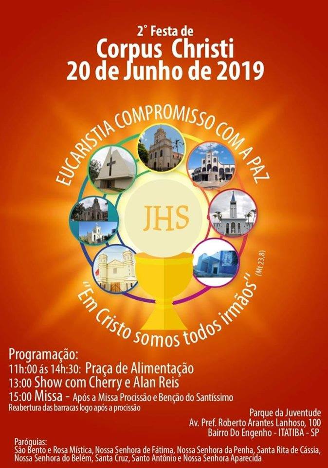 No próximo dia 20, as paróquias de Itatiba realizarão a 2º Festa de Corpus Christi, que ocorrerá no Parque Luis Latorre, à partir das 5h , sendo servido café para os participantes.