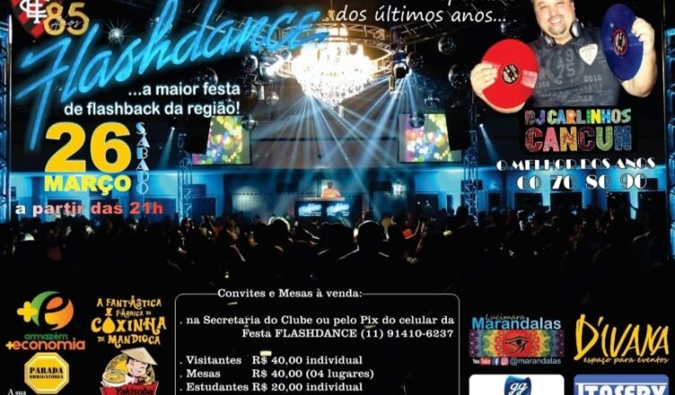 Convites e Mesas à venda na Secretaria do Clube ou pelo Celular da Festa FLASHDANCE 11 91410-6237.