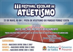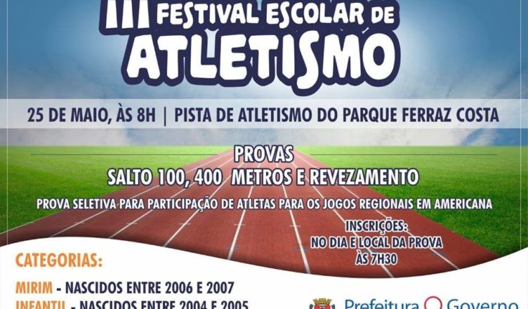 Neste sábado, 25, às 8h, na Pista de Atletismo do Parque Ferraz Costa, acontece a terceira edição  Festival Escolar de Atletismo, com provas de 100m, 400m e revezamento, nas categorias mirim, infantil e juvenil. A prova será seletiva para participação dos atletas nos jogos regionais em Americana. As inscrições serão feitas no dia e local da prova, às 7h30.
