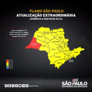 Nos outros dias, todo o estado continua na fase amarela, exceto a região de Presidente Prudente, que volta para a fase vermelha. A taxa de ocupação de UTIs (Unidades de Terapia Intensiva) para COVID-19 na região está em 83,1%.