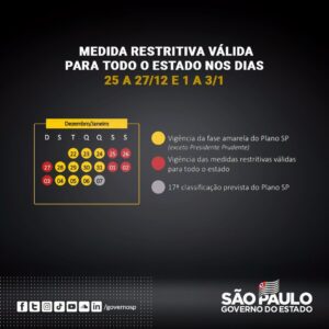 Com o aumento de casos e mortes de COVID-19, novas medidas restritivas se fazem necessárias para frear o avanço da pandemia. Nos dias 25 a 27 de dezembro e 01 a 03 de janeiro, apenas serviços essenciais poderão funcionar em todo o estado de São Paulo.
