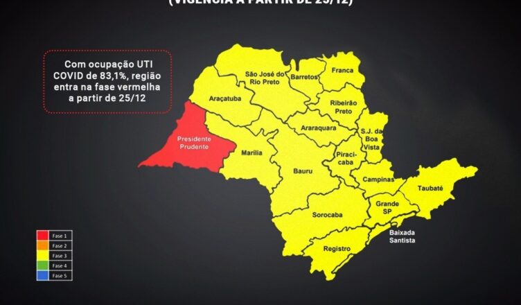 Nos outros dias, todo o estado continua na fase amarela, exceto a região de Presidente Prudente, que volta para a fase vermelha. A taxa de ocupação de UTIs (Unidades de Terapia Intensiva) para COVID-19 na região está em 83,1%.