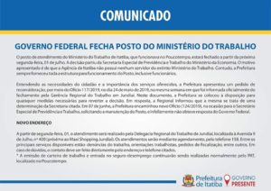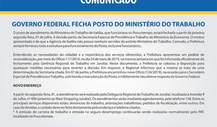 Governo Federal fecha posto do Ministério do Trabalho de Itatiba junho 28, 2019admin Comunicado Governo Federal fecha posto do Ministério do Trabalho de Itatiba Fonte: Assessoria de Imprensa Prefeitura de Itatiba