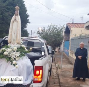 Monsenhor José Antônio de Carvalho acompanhando a passagem do andor de Nossa Senhora de Fátima percorrendo as ruas que pertencem à Paróquia. Os fiéis em suas residências receberam com muito amor a visita de Nossa Senhora. 🙏