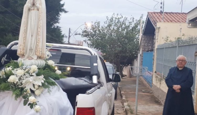 Monsenhor José Antônio de Carvalho acompanhando a passagem do andor de Nossa Senhora de Fátima percorrendo as ruas que pertencem à Paróquia. Os fiéis em suas residências receberam com muito amor a visita de Nossa Senhora. 🙏