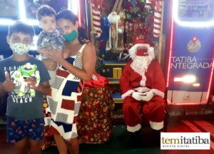 A mamãe Rosemeire Moraes , do bairro Bela Vista, com os filhos Leonardo Gael, no colo, e Ygor Gabriel visitando o ônibus do Papai Noel da Aicita, que nesta noite, permaneceu na Rua Francisco Glicério, em frente ao Banco do Brasil.
