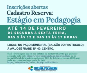 Para cadastro reserva, estão abertas as inscrições para estágio de Pedagogia na rede municipal de ensino da Prefeitura de Morungaba.