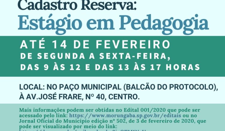 Para cadastro reserva, estão abertas as inscrições para estágio de Pedagogia na rede municipal de ensino da Prefeitura de Morungaba.