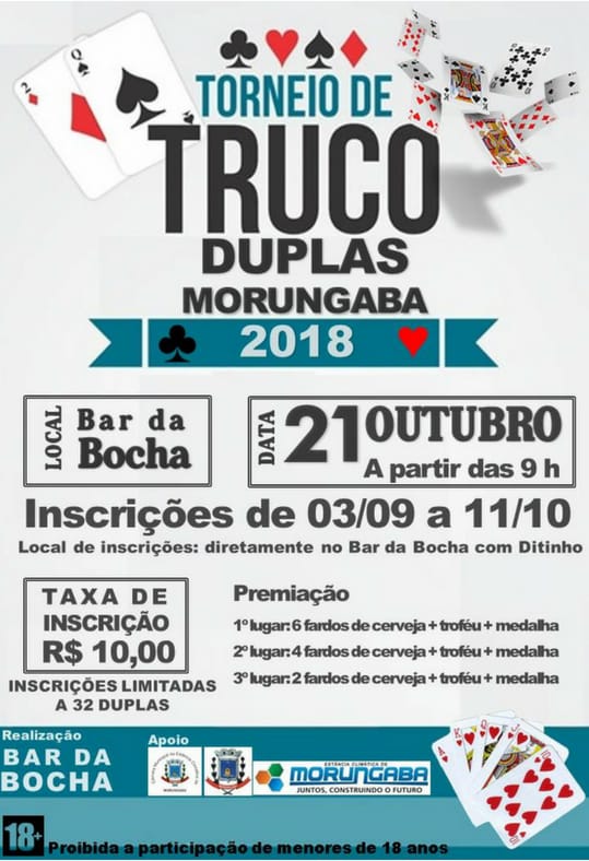 O Bar da Bocha, com apoio da Prefeitura Municipal da Estância Climática de Morungaba, abriu as inscrições para o Torneio de Truco em duplas.