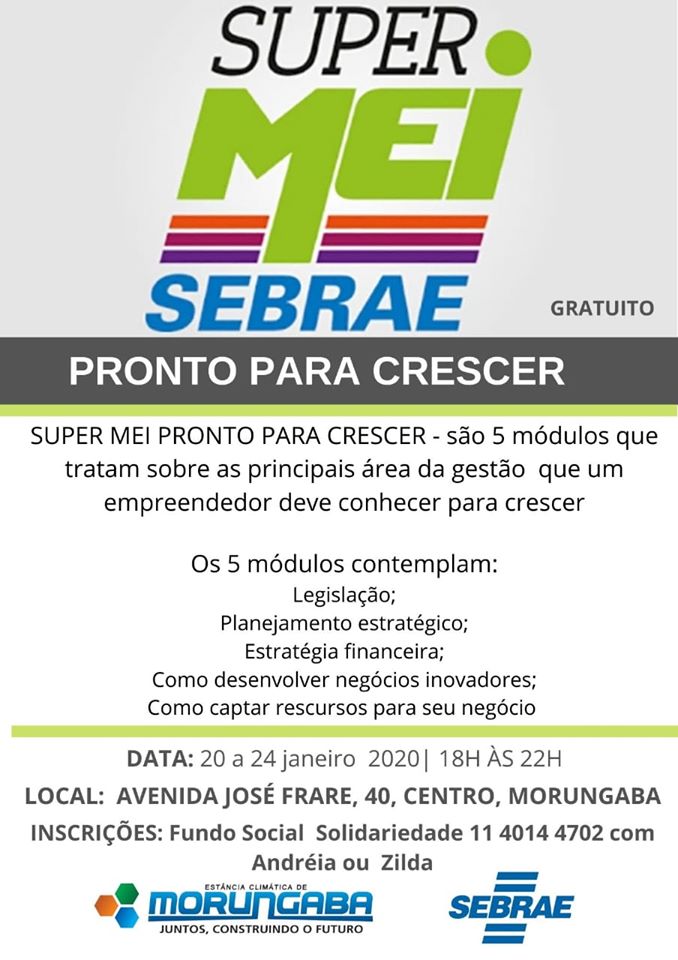 O programa “Pronto para Crescer” será realizado de 20 a 24 de janeiro com a carga horária de 20 horas. O curso é aplicado em cinco dias com os seguintes módulos: “Legislação”, “Planejamento Estratégico”, “Estratégia Financeira”, “Como desenvolver negócios inovadores” e “Como captar recursos para seu negócio?” – um tema por dia, sempre das 18 às 22h, na sala do Núcleo de Fomento ao Turismo.