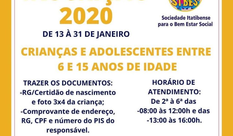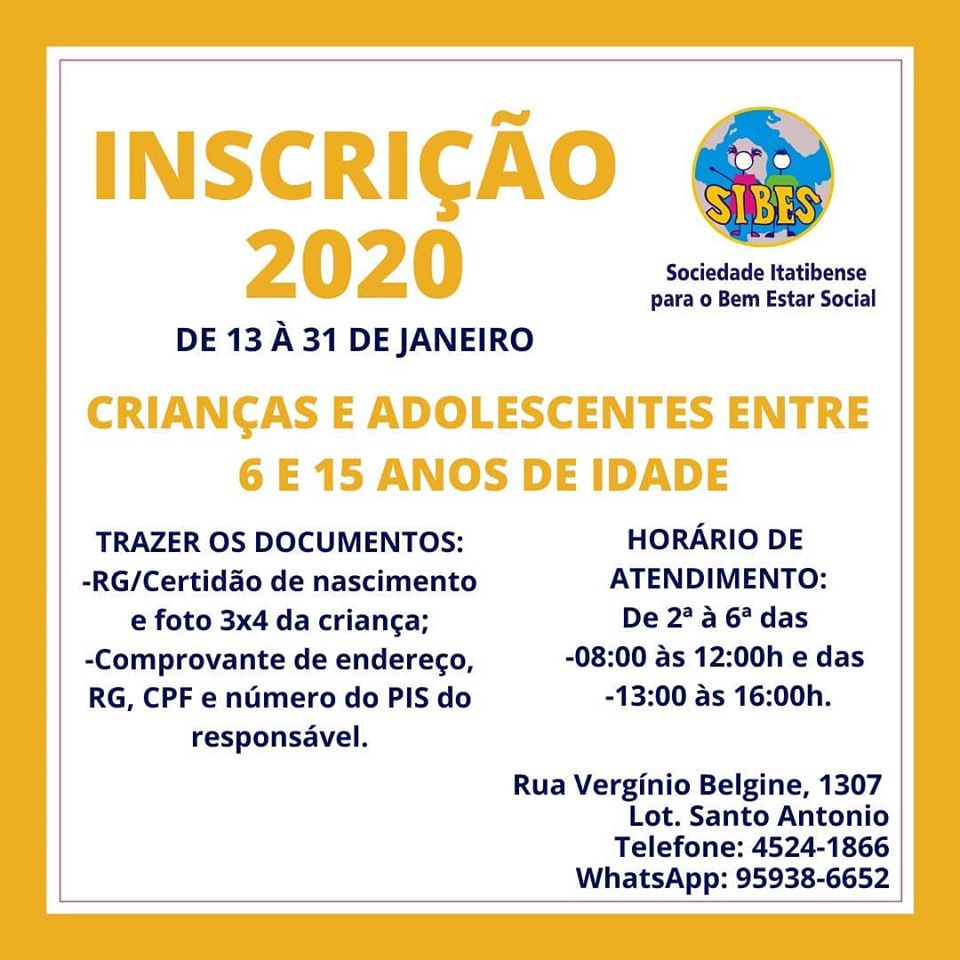 Inscrições SIBES – 2020 janeiro 8, 2020admin A SIBES é uma entidade socioassistencial que oferta atividades no contra turno escolar, como grupo psicológico de orientação, atividades esportivas, atividades artísticas, inglês, entre outras, venham nos conhecer !