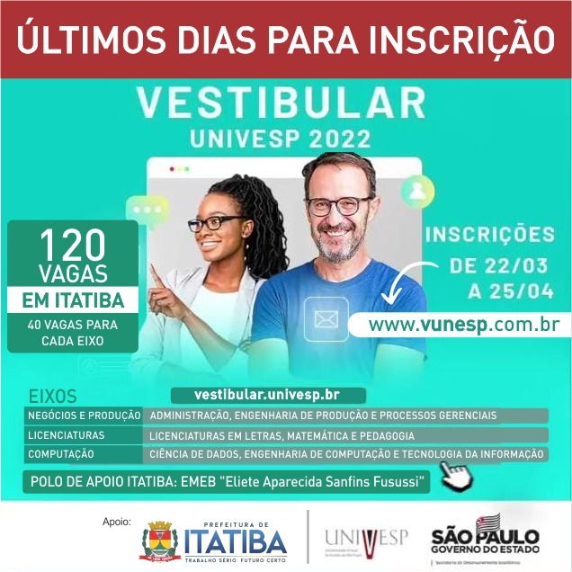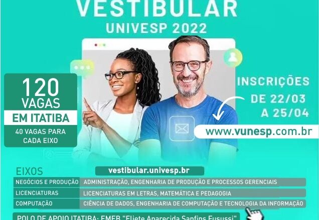 Terminam na próxima segunda-feira, 25/04, as inscrições para o Vestibular anual 2022 da Universidade Virtual do Estado de São Paulo (Univesp), com 120 vagas em Itatiba, à disposição dos interessados. Os cursos são divididos em três eixos, com 40 vagas cada.