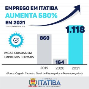 Durante o ano de 2021, Itatiba registrou um saldo positivo de 1.118 vagas novas de emprego com carteira assinada. O número é 581% maior do que o verificado em 2020, quando o saldo apontou apenas 164 vagas. Naquele ano, começou a pandemia de Covid-19, agravada no primeiro semestre de 2021.