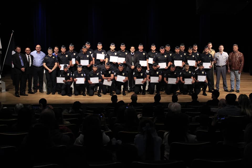 A fria tarde de sábado (3) foi de celebração no Teatro Ralino Zambotto, com a formatura de 26 novos Guardas Municipais. Após oito meses de treinamento, eles estão prontos e preparados para o serviço em diversas frentes.