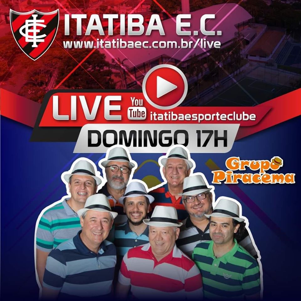 Live do Grupo Piracema abril 25, 2020admin Neste domingo, 26 às 17h no canal do YouTube do Itatiba Esporte Clube. www.youtube.com/itatibaesporteclube www.itatibaec.com.br/live Não perca !