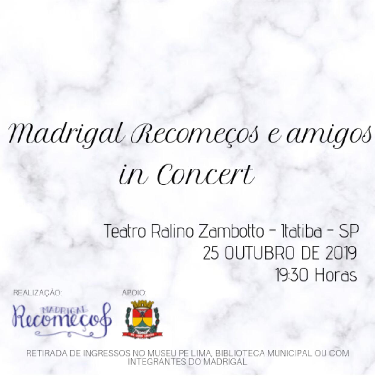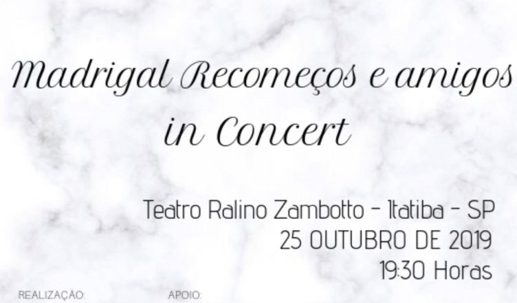 Será nesta sexta-feira, dia 25/10, à partir das 19h30 no teatro Ralino Zambotto.. Os ingressos podem ser retirados no Museu Municipal, na Biblioteca Municipal , no Conservatório Municipal “Alba Panzarin Degani” ou com os integrantes do Madrigal.