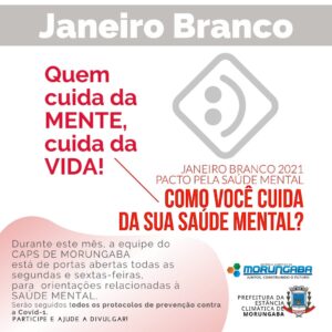A Prefeitura da Estância Climática de Morungaba, por meio do Departamento de Saúde, promoverá ações pela Campanha “Janeiro Branco” no Caps (Centro de Atenção Psicossocial) “Durvalina Martins Pelisson”, no Brumado.