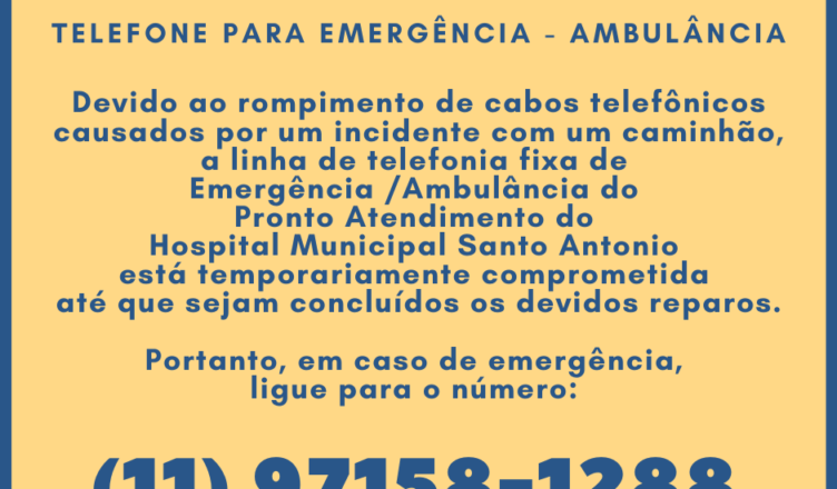 Emergência /Ambulância do Pronto Atendimento do Hospital Municipal Santo Antonio está temporariamente comprometida até que sejam concluídos os devidos reparos.
