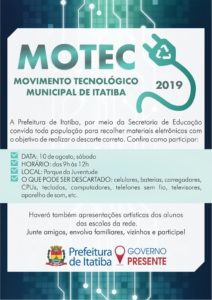 Neste sábado, 10, das 09h às 12h, acontece no Parque da Juventude o Motec, Movimento Tecnológico Municipal de Itatiba, para que a população em geral possa descartar, de maneira correta, materiais e componentes eletrônicos. Participe!