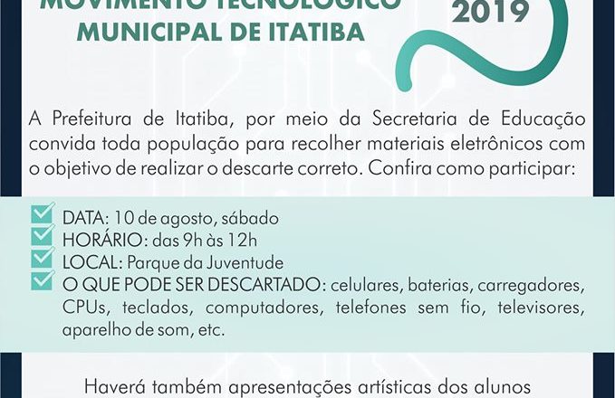 Neste sábado, 10, das 09h às 12h, acontece no Parque da Juventude o Motec, Movimento Tecnológico Municipal de Itatiba, para que a população em geral possa descartar, de maneira correta, materiais e componentes eletrônicos. Participe!