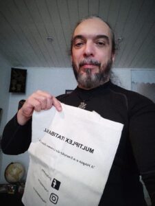 Estas são sacolas ecológicas de algodão crú que foram presenteadas aos nossos entrevistados ; o consagrado produtor musical e presidente da gravadora E-Musique Records, Lallo Moreyra e o consagrado baterista e professor de música, Bill Batera.