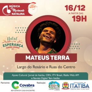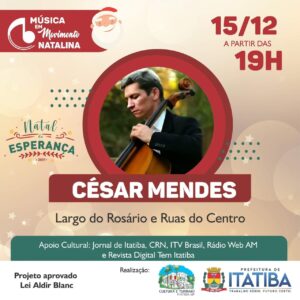 Música em Movimento Natalina dezembro 14, 2021dezembro 14, 2021admin Anote na agenda! Música em Movimento Natalina. Todo dia um artista diferente, à partir das 19h com saída do Largo do Rosário e passando pelas ruas do Centro da cidade **Divulgação Tem Itatiba**