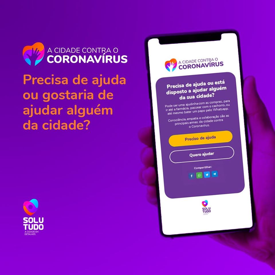 E foi com o objetivo de facilitar e potencializar esta mobilização nas cidades brasileiras, que a Solutudo lançou o projeto “A cidade contra o coronavírus”, uma plataforma que conecta pessoas que precisam de ajuda a outras que estão dispostas a ajudar. Seja uma ajudinha com as compras, para ir à farmácia, ou até mesmo bater um papo pelo Whatsapp, a plataforma online e gratuita fortalece os laços de pertencimento e de solidariedade entre as pessoas de uma mesma cidade.