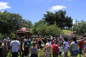 Depois de atender a todos e tirar fotos, fez a tradicional volta no campo para distribuição de balas, parte mais aguardada da festa, principalmente entre as crianças.