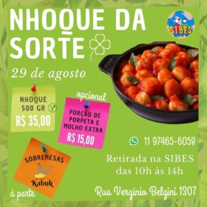 A SIBES está vendendo marmitinhas de 500 gr de nhoque e porção opcional de porpetas com molho extra, prontinhas para o seu almoço de domingo