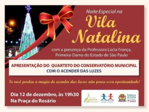 Amanhã, quarta feira, às 19h30, acontecerá uma noite especial na Vila Natalina com a apresentação do Quarteto do Conservatório Municipal, combinado com o acender das luzes!