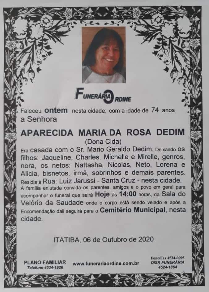 Nossos sentimentos à querida Família DEDIM, tão próxima de nós, pelo falecimento da Dona Cida , ocorrido ontem dia 05 de outubro de 2020, em Itatiba – SP.