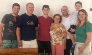 Comemoração dupla na Família Braido. José Luiz e a filha Fábia comemoram nova idade neste mês de junho. A foto de 2019 mostra os aniversariantes recebendo o carinho dos familiares, Paulo, Samuel, Domingas, Giuliano e Matheus.