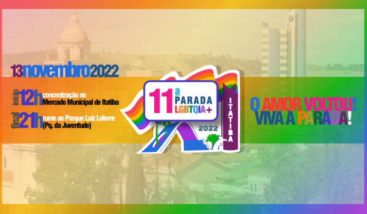 Convido você a vir festejar o retorno da 11º PARADA LGBTQIA+ DE ITATIBA, agora remodelada, com trio, DJs, barracas de bebidas e comidas, pastel, espetinhos, crepes, doces, batata frita e inúmeras atrações da região.