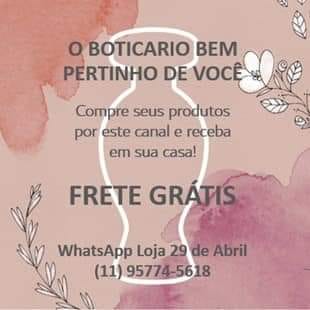 O Boticário bem pertinho de você! abril 1, 2020abril 1, 2020admin Frete Grátis ! Loja 29 de abril : 11-95774 5618 – Whatsapp