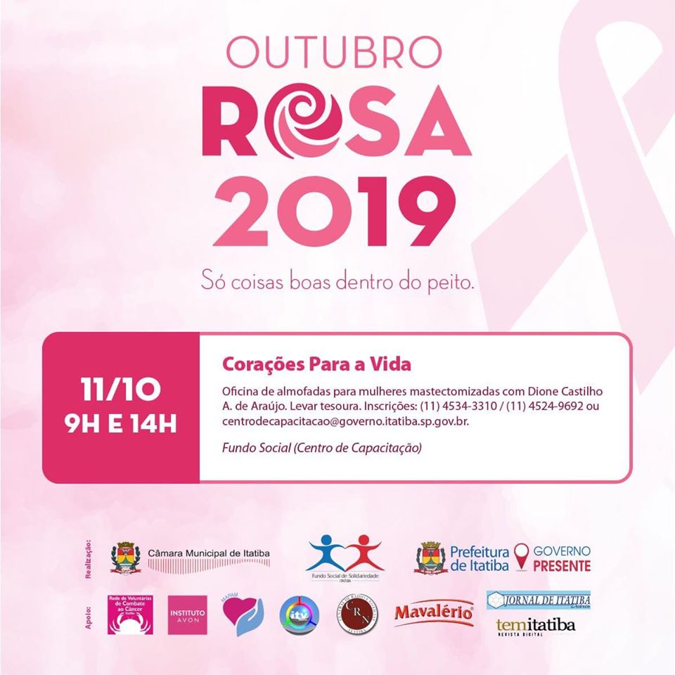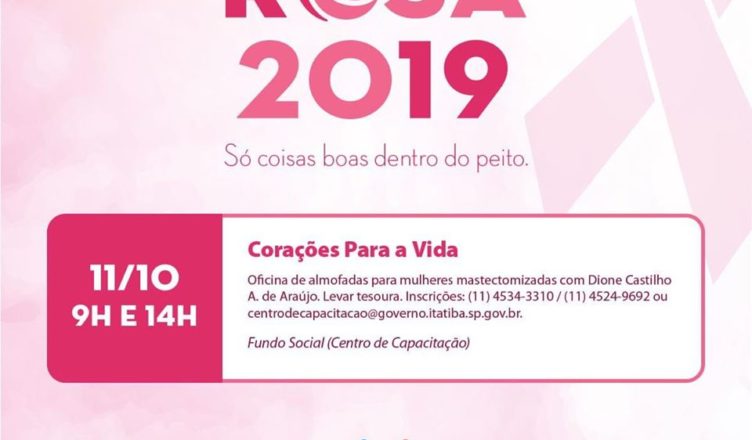 Na próxima sexta-feira (11), no Centro de Capacitação, no Paço Municipal, ocorrerá a oficina “Corações Para a Vida”. Na ocasião, voluntárias se reunirão para confeccionar almofadas em forma de coração. O objetivo é presentear pacientes mastectomizadas e despertar para os cuidados e prevenção do câncer de mama.