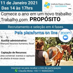 No próximo dia 11 de Janeiro, o Instituto Passo a Passo Equoterapia fará o recrutamento e seleção de candidatos para atuar como auxiliar administrativo e captação de recursos (área comercial), das 14h às 17h.