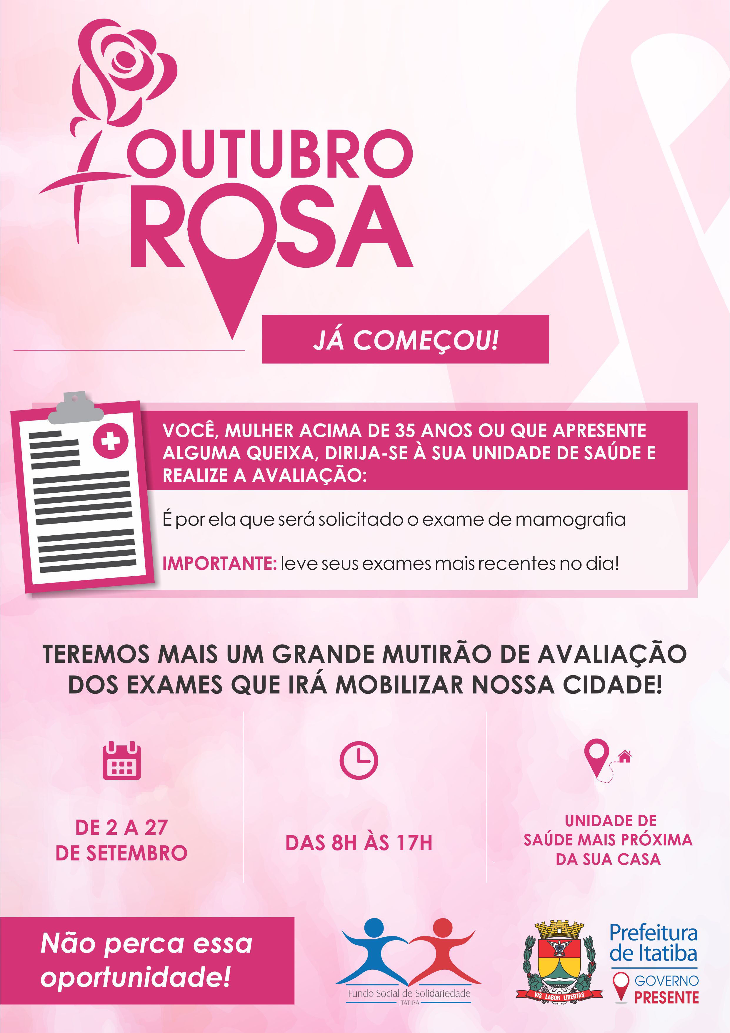 O Outubro Rosa, do Fundo Social de Solidariedade, começa mais cedo em Itatiba. Todas as mulheres acima de 35 anos, ou que apresentem alguma queixa, poderão retirar a partir de segunda-feira, dia 02/09, na Unidade de Saúde mais próxima, a sua guia para agendamento do exame de mamografia diretamente no IMA.