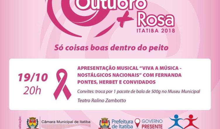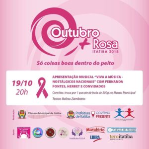Outubro + Rosa Itatiba 2018 outubro 18, 2018admin Nessa sexta, 19, tem show com amplo repertório brasileiro no Teatro e reapresentação da coreografia “Divas”, muito aplaudida no Concurso Miss Plus Size 2018. Compareça!