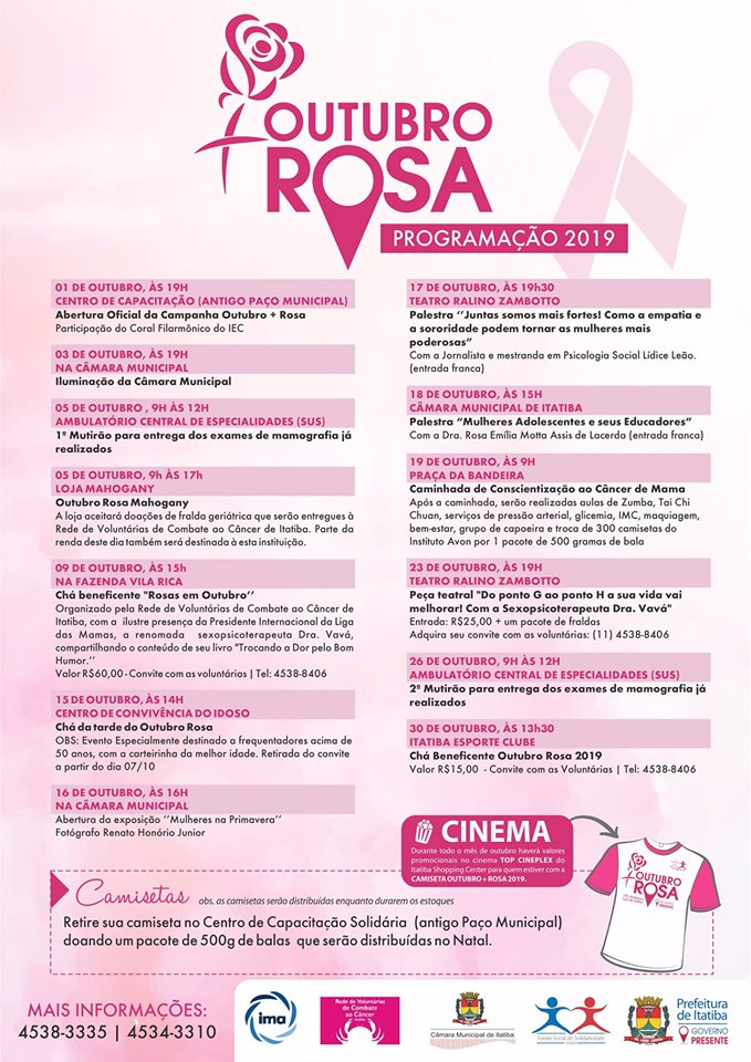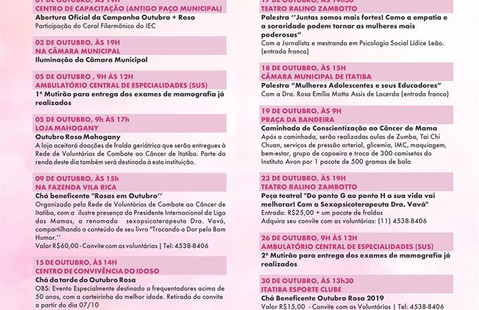 O sábado, 5, começa com o 1º mutirão para entrega dos exames de mamografia já realizados. Este mutirão acontece no Ambulatório Central de Especialidades, SUS, das 9h às 12h. No mesmo dia, das 9h às 17h, a loja Mahogany, localizada na Rua Rangel Pestana, 197, no Centro de Itatiba, receberá doações de fraldas geriátricas que serão entregues à Rede de Voluntárias de Combate ao Câncer de Itatiba. Parte da renda deste dia também será destinada à esta instituição.