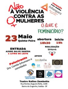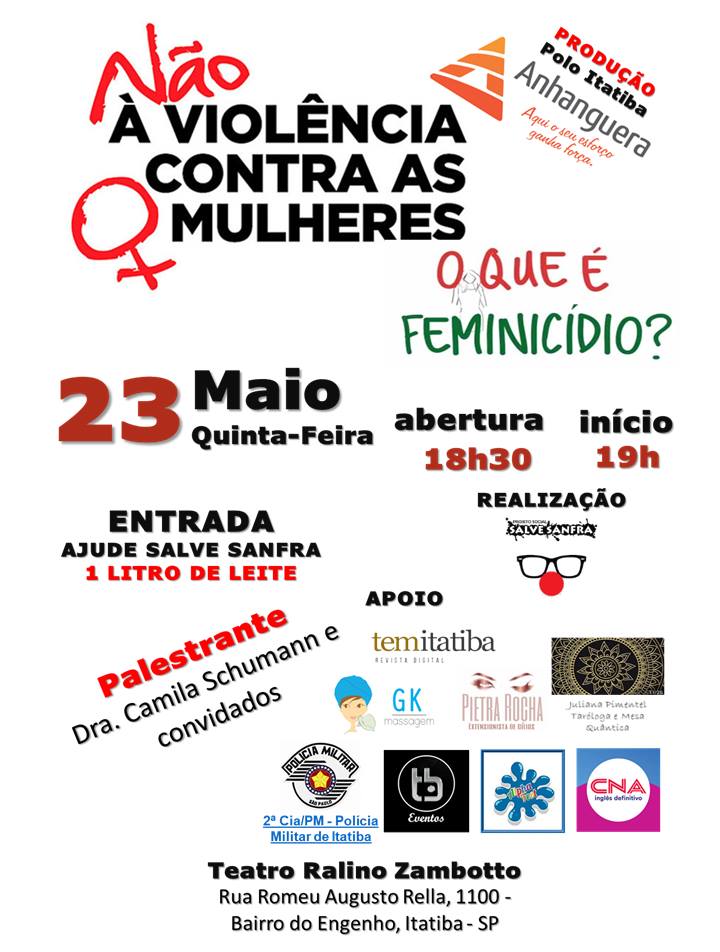 Feminicídio é o homicídio cometido contra mulheres motivado por violência doméstica ou discriminação de gênero. Infelizmente, casos são noticiados diariamente e esse número cresce de maneira assustadora e alarmante. O Polo Anhanguera Itatiba em parceria com a ONG Salve Sanfra traz para a cidade a palestra “Não à violência contra as mulheres, o que é feminicídio?” com a palestrante Dra Camila Schumann e convidados
