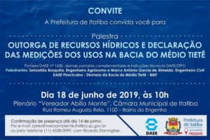 No dia 18 de Junho, às 10h, para entender as aplicações da Portaria DAEE nº 1630 e diversas outras portarias complementares, a Prefeitura de Itatiba, por meio da Secretaria de Meio Ambiente e Agricultura, oferecerá gratuitamente para toda a população da cidade a palestra “Outorga de Recursos Hídricos e Declaração das Medições dosUsos na Bacia do Médio Tietê”.