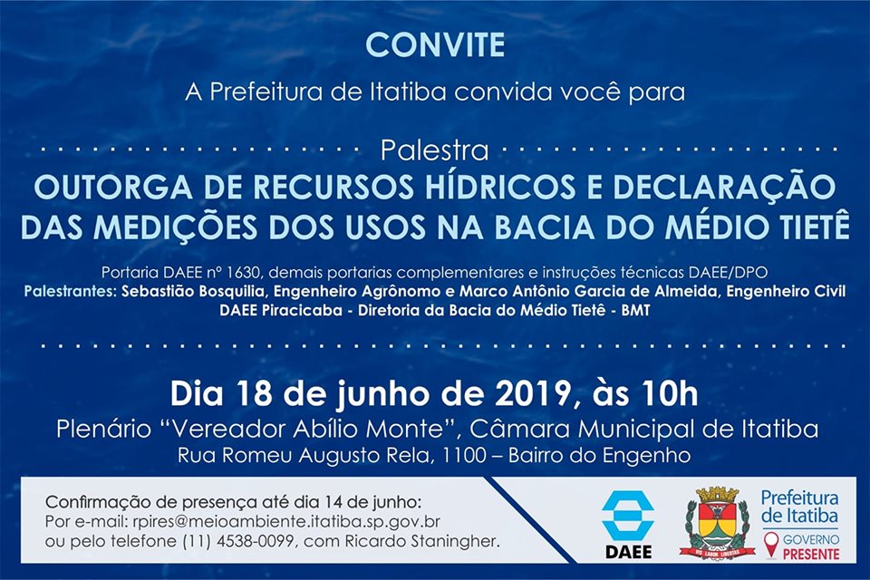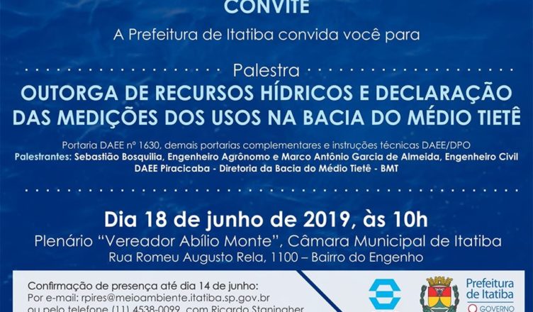 No dia 18 de Junho, às 10h, para entender as aplicações da Portaria DAEE nº 1630 e diversas outras portarias complementares, a Prefeitura de Itatiba, por meio da Secretaria de Meio Ambiente e Agricultura, oferecerá gratuitamente para toda a população da cidade a palestra “Outorga de Recursos Hídricos e Declaração das Medições dosUsos na Bacia do Médio Tietê”.
