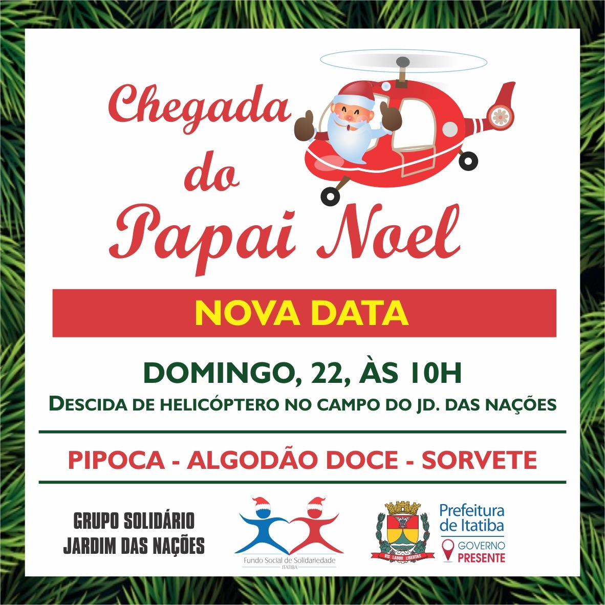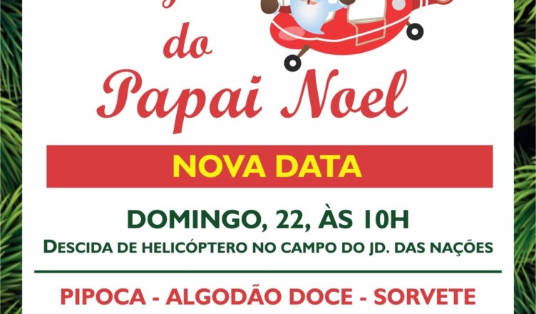 A chuva forte do último sábado apenas adiou a chegada do Papai Noel no Jardim das Nações. No próximo domingo, 22/12, às 10h, o bom velhinho pousa de helicóptero no campo de futebol do bairro.