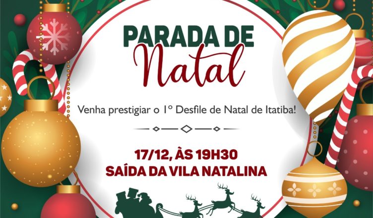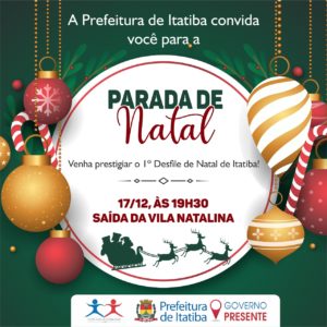 Parada de Natal dezembro 16, 2019admin A Prefeitura de Itatiba, por meio do Fundo Social de Solidariedade, convida para a “Parada de Natal”. Prestigie o 1º Desfile de Natal de Itatiba nesta terça-feira,17, às 19h30, com saída da Vila Natalina. Participe!